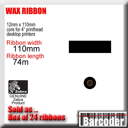 Box of Genuine Zebra thermal transfer ribbon. Zebra 2100. 110mm wide. 74 metres long. Black. Enhanced wax (for coated or uncoated paper label stock). Suitable for 4" printhead desktop thermal transfer printers only. 1 box of 24 minimum.